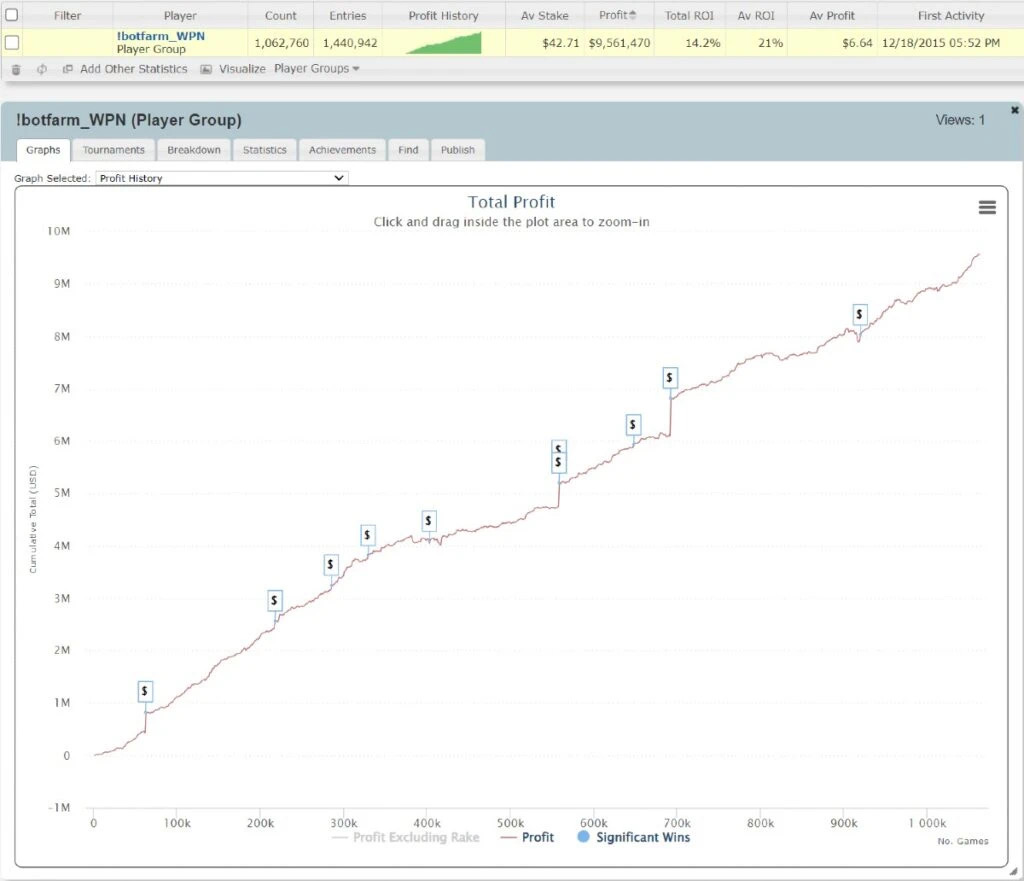 根据2+2用户TylerRM的说法,被指控的机器人能够在 ACR 的在线扑克锦标赛中持续击败150万余名参赛者,并在此期间赢得近1000万美元的现金奖励,其中仅2023 年就获得了超过370万美元的奖金。