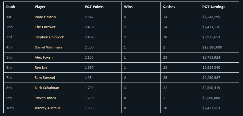 2023年PGT赛季已经结束,Isaac Haxton成为年度最佳选手。Haxton在本赛季共获得2,847个PGT积分,其中包括 4 场胜利、14笔奖金和7,243,295美元的PGT收入。