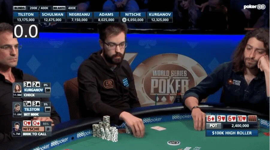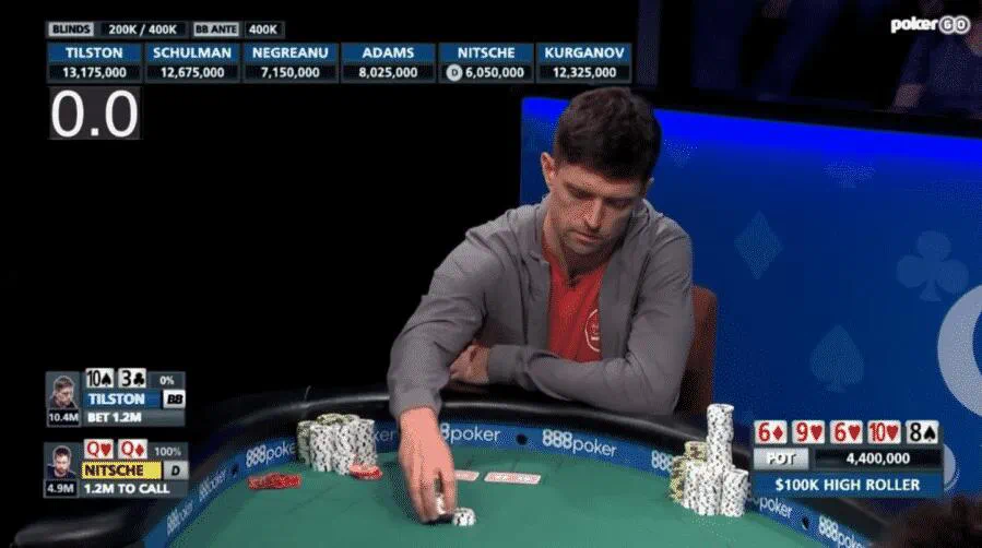 这一手肯定是以非正统的方式进行的,这并不是因为Dominik的跛入非正统,而是因为它造成了一种两个牌手都不确定对方范围的情况,导致了很多假定和猜测。