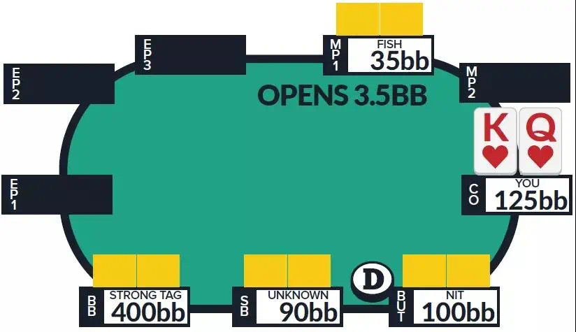 有效筹码量35BB。鱼玩家在中间位置率先加注到3.5BB,你在CO位置拿着KQ。3-bet将使你陷入底池——即使你只3-bet到11BB,如果鱼玩家翻前全压,你也会得到不错的跟注价格。