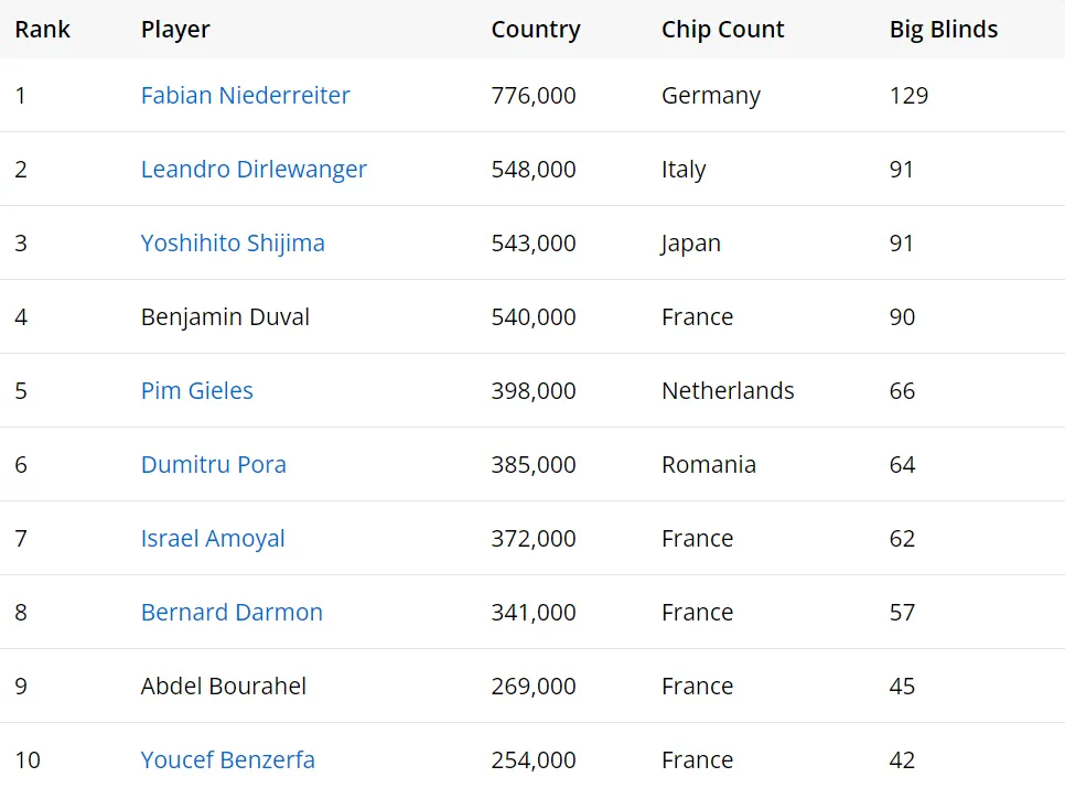 比赛结束后,德国选手Fabian Niederreiter 以77.6w记分领先。其他晋级的幸运儿包括扑克大使Marle Spragg和以及同样充满实力的Maria Konnikova等。