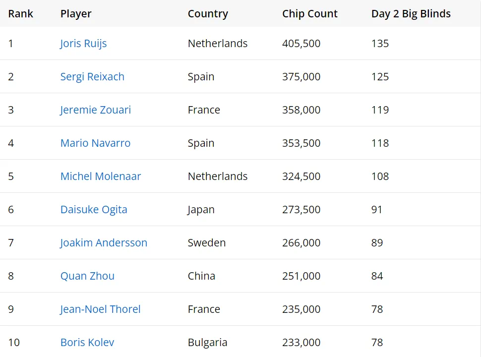 前五名中的最后两名玩家是Mario Navarro和Michel Molenaar。排名前10的其他杰出选手包括中国选手周全(251,000)和法国总奖金榜冠军Jean-Noel Thorel(235,000)。