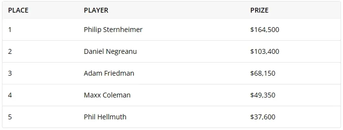 冠军获得了164,200美元,根据The Hendon Mob的统计,使他的现场比赛奖金总额超过240万美元。Daniel Negreanu作为第二名收到了103,400美元奖金,这是他今年在七次进入现金圈的第二次亚军。