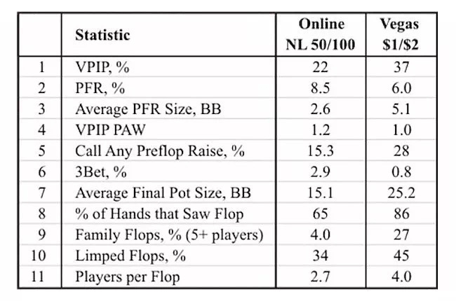 虽然某些桌子比其他桌子紧,不同扑克室之间的VPIP差距非常小。早上的桌子可能稍紧一点,而周末的牌桌会松一点,但差异不是特别明显。即使2/5美元的拉斯维加斯现场局也是同样的松。