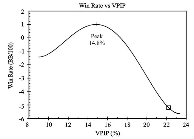 在我的第一本扑克书《扑克统计学》中,我分析了约600万手来自线上扑克NL50和NL100级别的历史牌局。下图显示了采用各种VPIP的线上牌手对应的平均赢率。