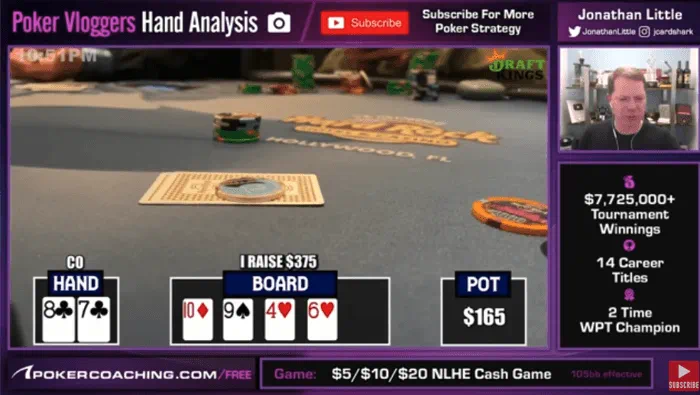 在这手牌中,我们将讨论哪些听牌适合在翻牌阶段下注,哪些应该用过牌。一般来说,仍然可以有利可图地跟注过牌-加注的听牌是不错的下注选择。摊牌价值低但仍具有良好赢率的听牌非常适合在您的下注范围中使用。我还讨论了博弈论最优(GTO)和剥削之间的区别。