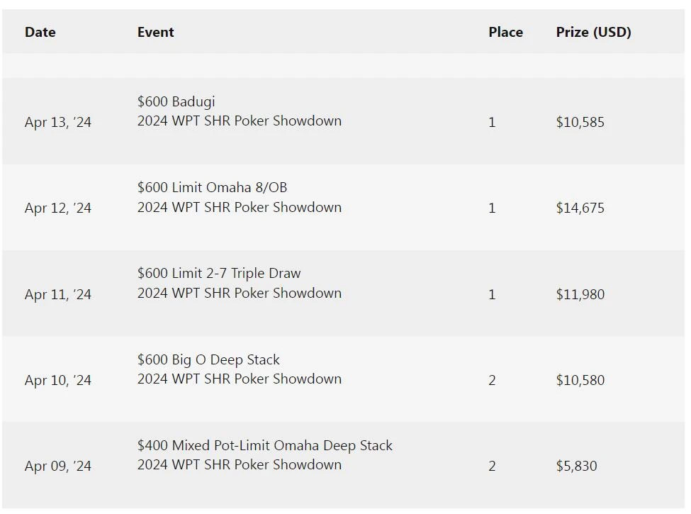 Hoenig在2022年首次在WSOP收获奖金后,又在2023年赢了六笔,其中包括在 10,000美元底池奥马哈锦标赛中以第二名的身份赢了369,972美元。