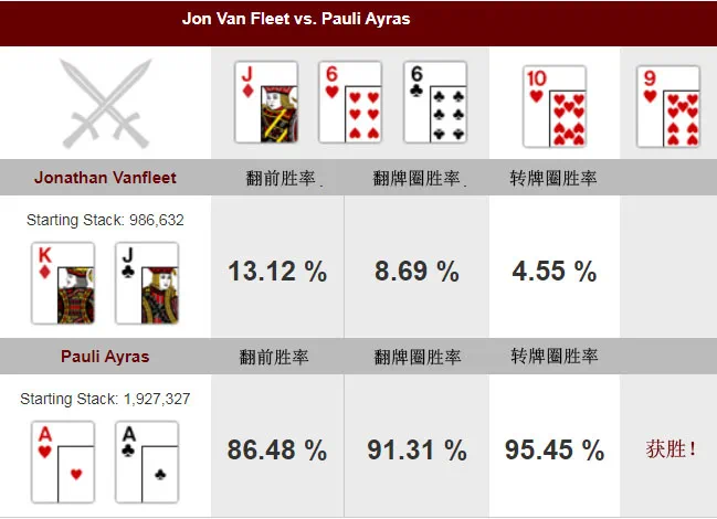 这手牌过后Van Fleet只剩不到10BB筹码,而Ayras跃升至筹码量排行榜第二位。最终Van Fleet在第十名被淘汰,而Ayras拿到第四名,获得487500美元奖金。