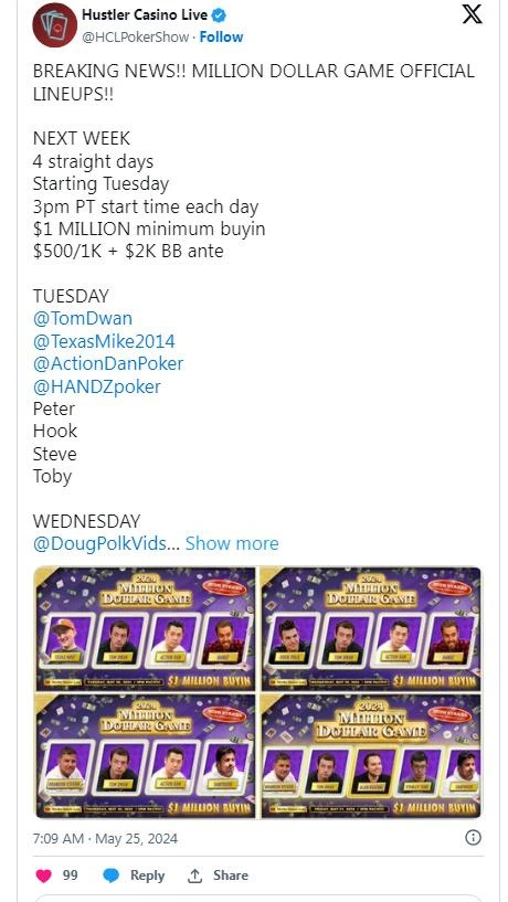 2024年Hustler Casino Live百万美元游戏的每日阵容已经公布,Tom Dwan和Doug Polk将在为期四天、备受瞩目的现场直播中进行对决。