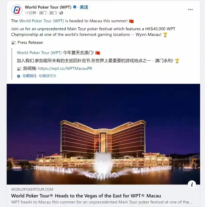 原定于6月举行的WPT澳门赛将不再继续。WPT、永利澳门和Allied Gaming and Entertainment对给计划前往澳门参赛的世界各地选手带来的不便和失望深表遗憾。