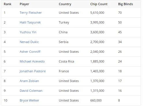 随后,主赛事冠军Greg Merson(第 67 名)、Jeremy Becker(第 58 名)、Robert Mizrachi(第 55 名)、Kristen Foxen(第 45 名)、David “Bakes” Baker(第 40 名)和Dan Zack(第 26 名)来到了领奖台。卫冕世界冠军Daniel Weinman在第52名被Xiaohu Liu淘汰,丹牛则倒在第50名。