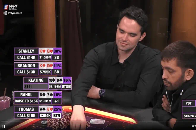 蒙面神秘玩家Thomas在按钮位置用A♠6♥跟注,DoorDash联合创始人Stanley Tang在小盲位用K♥Q♥,Brandon Steven在大盲位用他的K♦10♥也跟注, straddle的Keating持10♠9♠也加入其中。