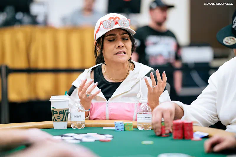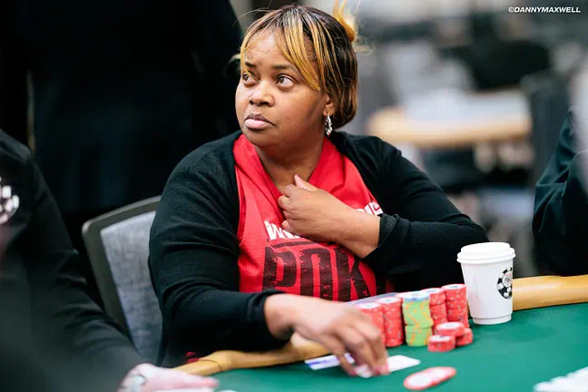 Carolyn Adams被淘汰前的一瞬间,前方的记者在翻牌后恢复了她的牌局。
