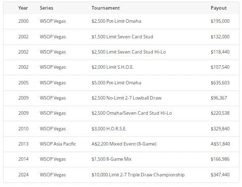 Ivey也许是20年来公认的最优秀的玩家,他在世界扑克锦标赛上结束了长达10年的冠军荒,击败Danny Wong,赢得了他的第11条金手链。这次胜利使他超越了Johnny Chan、Erik Seidel和已故的Doyle Brunson等人,跃居历史排行榜第二位。排在他前面的只有Phil Hellmuth。