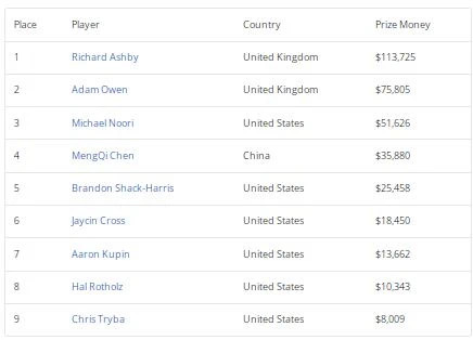 Richard Ashby在与Adam Owen的单挑中克服了8:2的记分牌劣势,从406名参赛者的比赛中脱颖而出,赢得了他的第二条金手链。这场胜利让Ashby获得了113,725美元的奖金,这是他继2010年之后第二次在同一赛事中获胜。