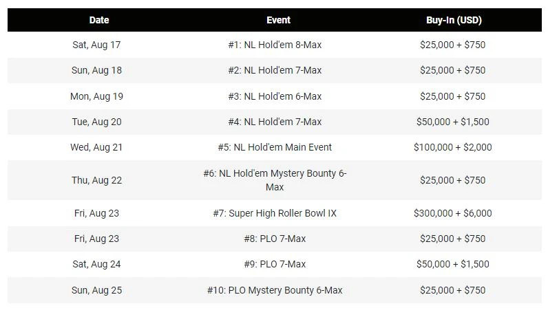 超级豪客碗系列赛的所有赛事都将首次采用单次淘汰赛制。整个赛程包括十场比赛,买入金额从25,000美元到 300,000美元不等。其中包括无限注德州扑克和无限注奥马哈赛事,而一直广受欢迎的神秘悬赏赛也将在这两种赛制中出现。