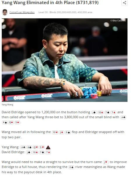 中国选手王阳在与Eldridge的对抗中败下阵来,获得了第四名及731,819美元奖金的成绩。