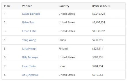 David Eldridge从476名参赛选手中脱颖而出,在单挑中击败了扑克名人堂成员Brian Rast夺得了他的第二条世界扑克系列赛手链和2,246,728美元的冠军奖金。