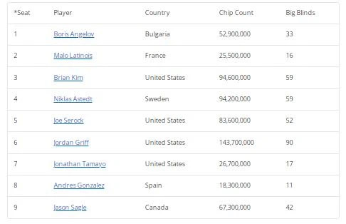 Griff面临着一场艰苦的战斗,因为两位扑克界最有成就的玩家–美国高额豪客赛常客Brian Kim和瑞典线上传奇人物Niklas “Lena900” Astedt都获得了令人印象深刻的记分牌,他们将以超过50个大盲重返决赛桌。