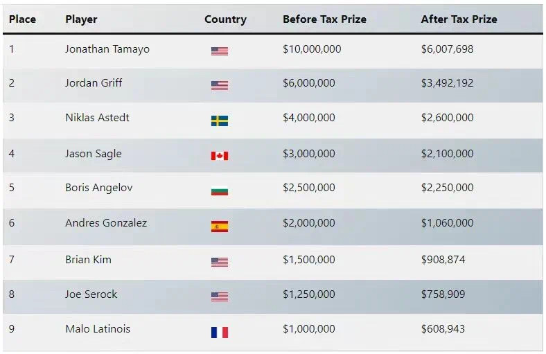决赛桌9人组可谓个个赚的盆满钵满,但最终到手的奖金会“缩水”多少呢?我们直接来看数据: