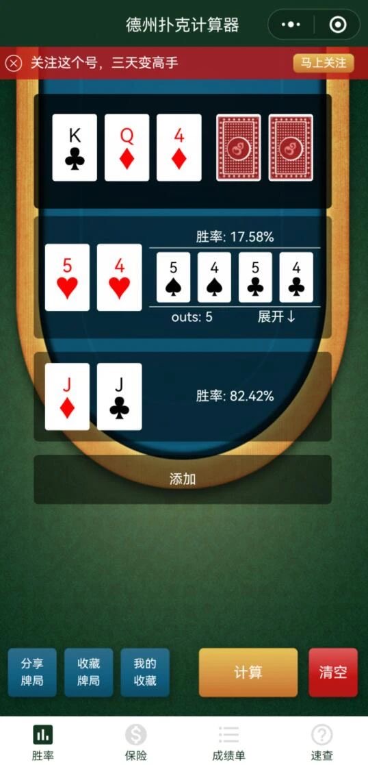 翻牌:K♣Q♦4♦。根据胜率计算器,此时Mike有82.4%的机会赢得底池,而Keating只有17.6%。