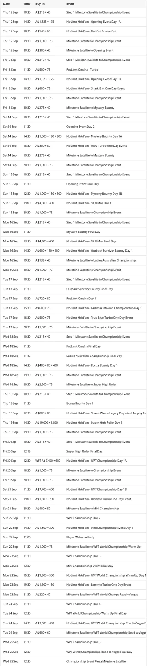 本次赛事的亮点是参赛费为8,000澳元的WPT澳大利亚锦标赛,选手们将争夺享有盛誉的Mike Sexton WPT冠军杯的参赛资格。9月20日和21日将举行两天的首日赛事,来自世界各地的顶尖选手将齐聚一堂,争夺聚光灯下的冠军,竞争必将十分激烈。