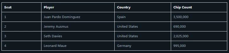 在决赛桌早期,Dominguez击败Ausmus拿下大彩池后成为记分牌领先者,而Ausmus则跌落到危险区。