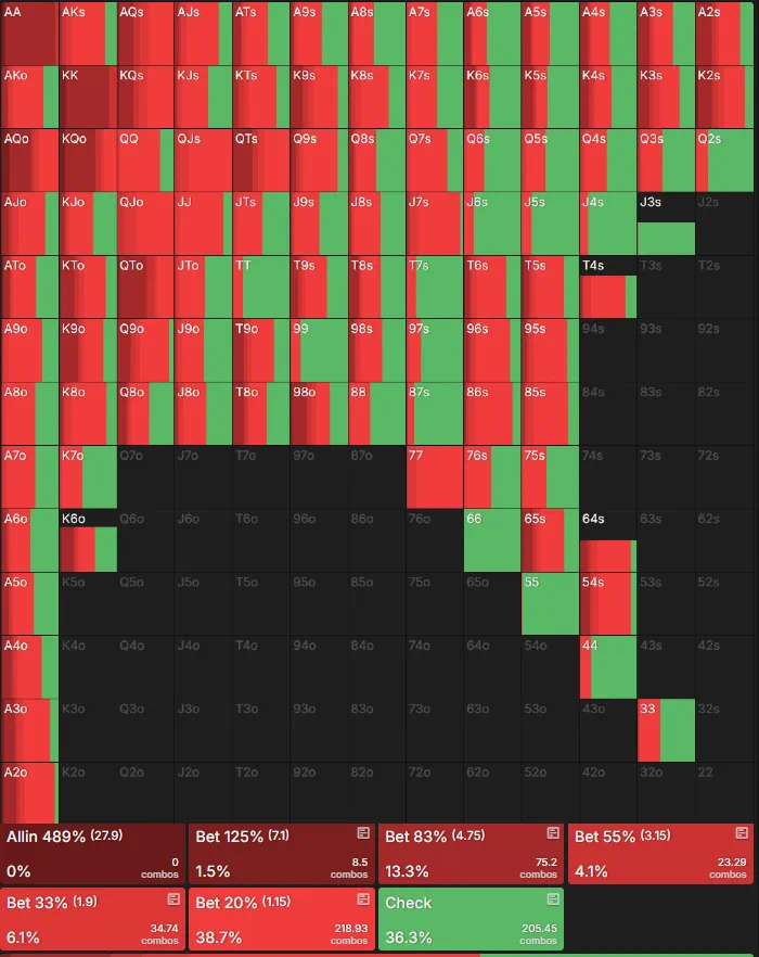 首先要注意的是翻牌前的范围不同,Chip EV范围稍宽一些。ICM范围要激进得多,下注率为74.1%,而EV为63.7。然而,虽然ICM范围内的过度下注更多,但在大多数情况下,下注规模已下降至20%。