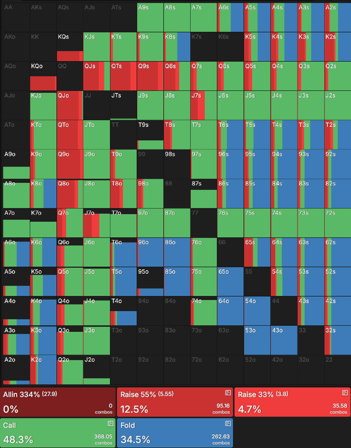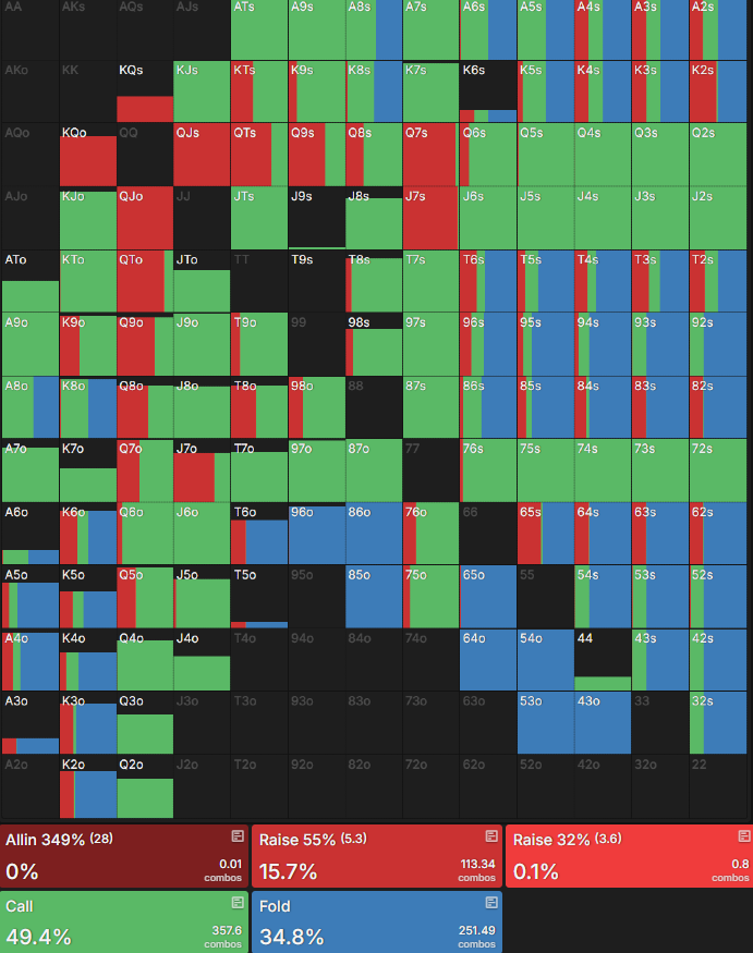 这里的差异稍微微妙一些,但在ICM示例中,过牌/加注的次数较少,而当BB过牌/加注时,加注较大则更受青睐。这对我来说很有意义,在ICM场合,我们会尽量避免大底池,但如果我们要加注,我们希望给对手一个弃牌的机会。