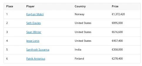 紧随其后的是Santhosh Suvarna,他以第五名的成绩出局。尽管Suvarna是决赛桌上唯一一位没有打过职业扑克的选手,但他已经牢牢地巩固了自己在高额桌扑克界的地位。Suvarna已经在全球六位数买入赛事中取得了令人印象深刻的成绩,这次的成绩将成为他扑克生涯中又一次重要的决赛桌,包括他在2024年第二次进入EPT决赛桌,当时他在巴黎赢得了25,000欧元的豪客赛。