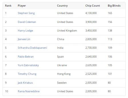 不过,他们俩都仰望着Stephen Song,当晚他以4,130,000的记分牌领先于40名幸存者。这位美国锦标赛强者,在现场锦标赛中赢得的奖金超过650万美元,在当天的比赛中赢得了多个大底池,这使他成为最难对付的对手。Song已经打破了他之前的最佳EPT成绩,去年他在这项赛事中获得了第47名。