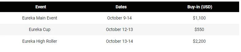 该系列赛事的日程安排了12天的锦标赛活动,从10月9日的Eureka主赛事开始,紧随其后的是Eureka杯和Eureka豪客赛。