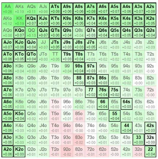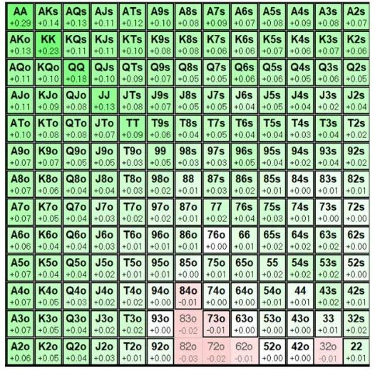 当我们在Hold’em Resources计算器中给Akimov提供最小加注或全下的选择时,他实际上可以玩他所有的手牌。