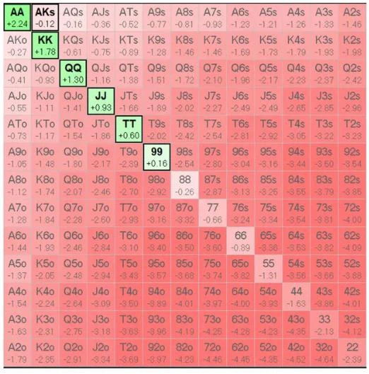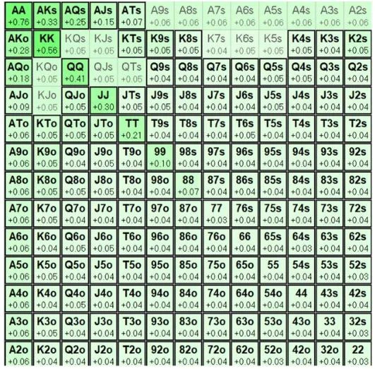所以,尽管全下是有利可图的,但最小加注仍然是更优的选择。这意味着你可以玩你所有的手牌,而不必依赖扑克之神在你被KK跟注时的眷顾。