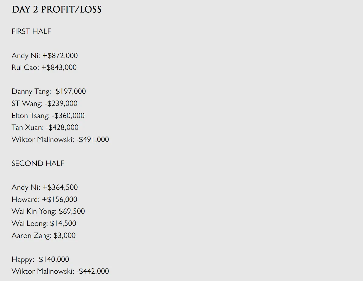Elton Tsang和谈轩在第二天的表现不佳,均未能重现首日的辉煌。Elton Tsang亏损36万美元,而谈轩在输给Andy Ni后,最终亏损42.8万美元,经历了戏剧性的转变。