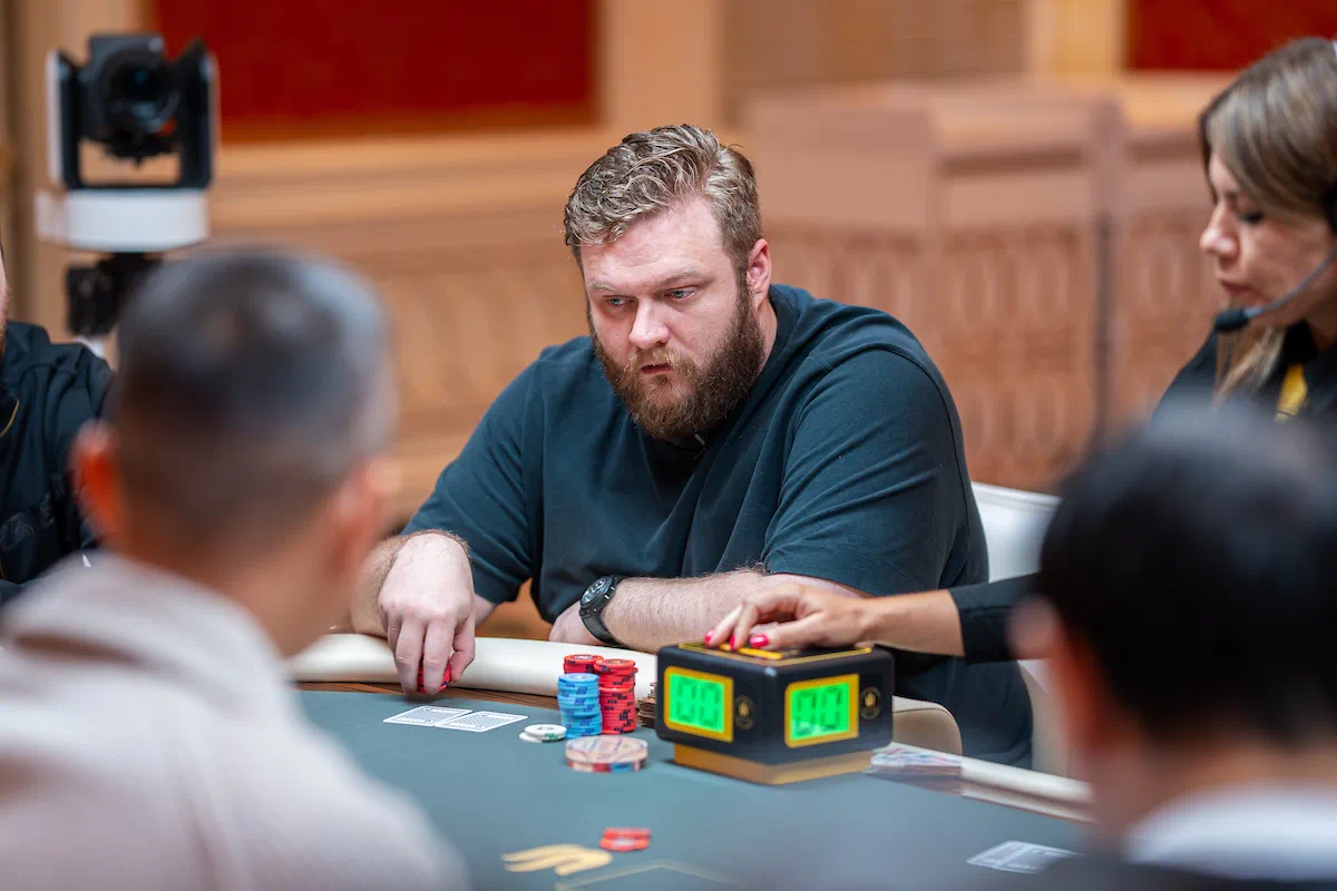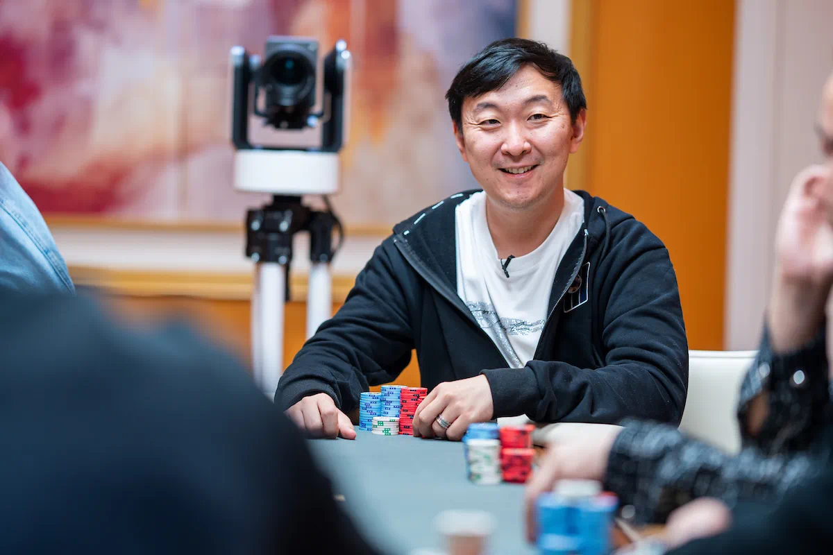 但比赛的最后关头他终于迎来了转机。他在最后一个小时开始发力,尤其在从曹睿手中巧妙地夺下一个巨大的底池后,脸上终于绽放出了久违的笑容。