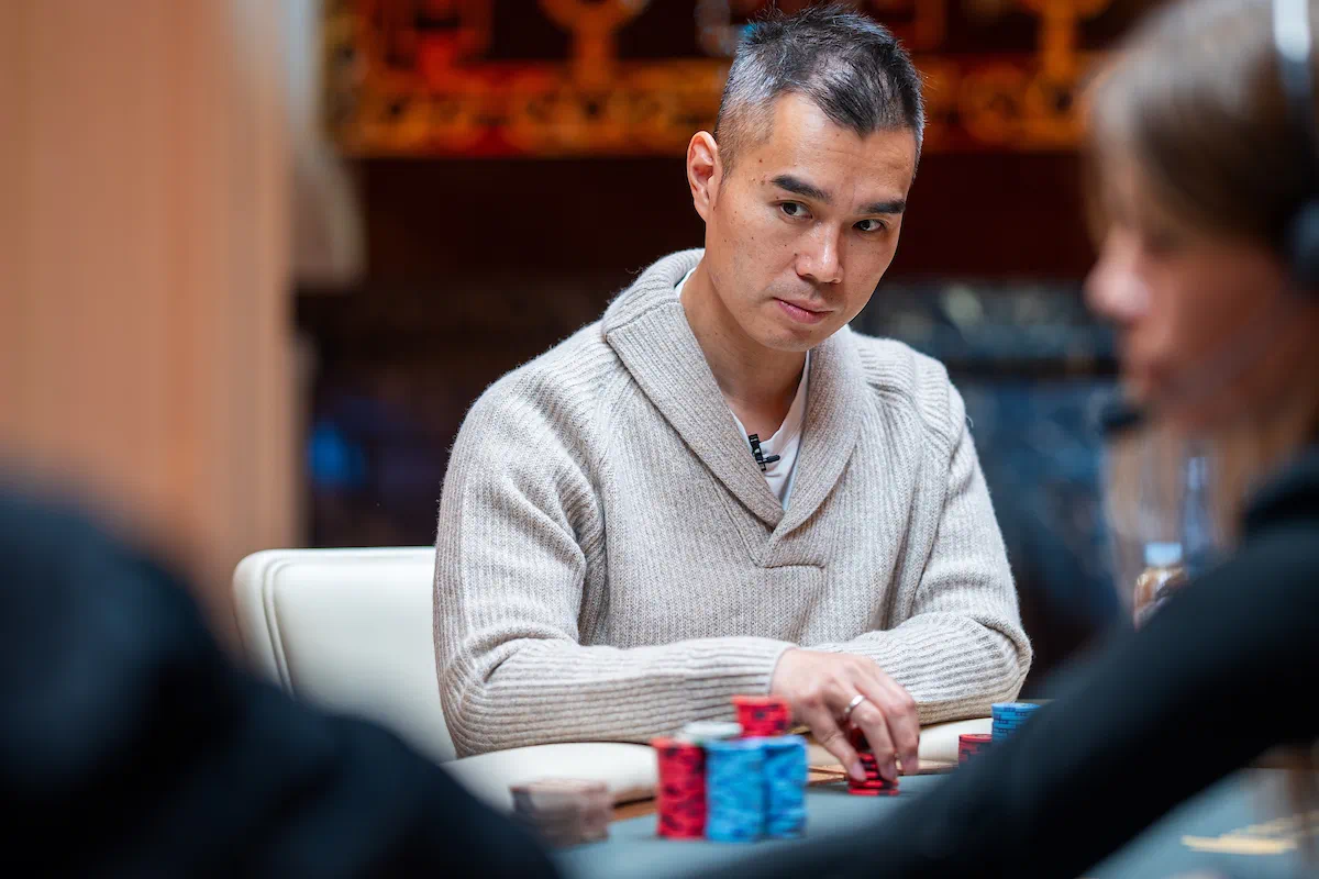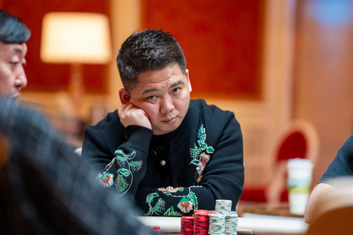 那天激战中他并非没有过高光时刻。虽然一开始就损失了首次的买入费,但第二次卷土重来时,他便以微弱优势获胜。比赛中期他更是从ST Wang手中巧妙夺走了一个56万底池,此时的收益看似相当可观。