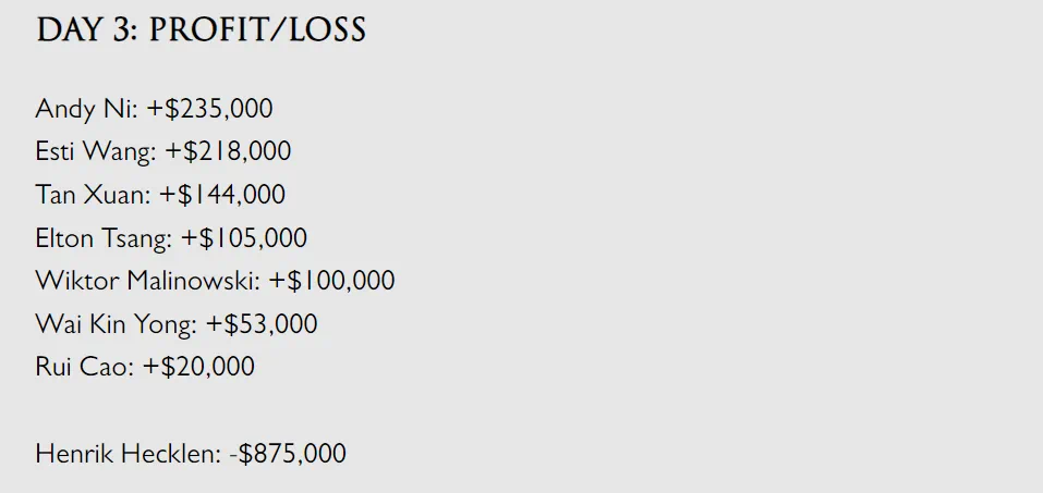 在决定性的最后一个小时,Hecklen企图在多个底池中放手一搏,可惜结果却颗粒无收。随着他的连连败退,最终不得不咽下苦果,以87.5万美元的损失结束了这个艰难的一天,成为了当天唯一未能盈利的孤胆英雄。
