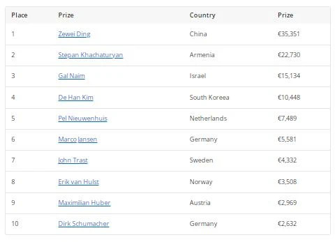 Ding和Khachaturyan之间的单挑对决只持续了五手牌。两人交换了几个小底池,然后Khachaturyan在错误的时间推入了他的记分牌,用5-3非同花对抗Ding的口袋对K。Ding以与决赛桌开始时相同的方式结束了决赛桌——用口袋对K赢得了当晚的最终底池、WSOP金手链和35,351欧元的最高奖金。