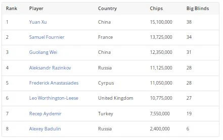 中国选手Xu Yuan以15,100,000的记分牌领先,紧随其后的是法国选手塞 Samuel Fournier,他在比赛后期的多个时刻领先,但在比赛末尾跌至第二,最终记分牌为13,725,000。