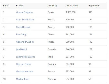 其他晋级第二天的选手包括Santhosh Suvarna (601,000)、20,000美元无限德州扑克冠军 Ognyan Dimov(584,000)、 Kayhan Mokri ((219,000)和Dimitar Danchev (182,000)。卫冕冠军Pardo(262,000)和 Aleksejs Ponakovs(219,000)需要两颗子弹才能在当天幸存下来,而EPT冠军Adrian Mateos用了三发子弹,最后以192,000的记分牌结束。