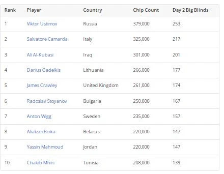 当最后一手牌被发牌时,Viktor Ustimov以379,000记分牌成为260名剩余玩家中的记分牌领先者。