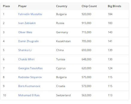 在这一天的赛事中,最终有144名选手成功将他们的记分牌封存,而保加利亚选手Fahredin Mustafov以920,000记分牌的领先优势成为当天的领头羊。紧随其后的是俄罗斯选手Ivan Zabiiakin,他以915,000记分牌的总数位居第二,而德国选手Oliver Weis则以715,000记分牌排在第三位。