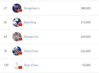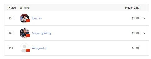而Ren Lin、Guiyang Wang和Wenguo Lin则在进入奖励圈不久后退出了比赛。