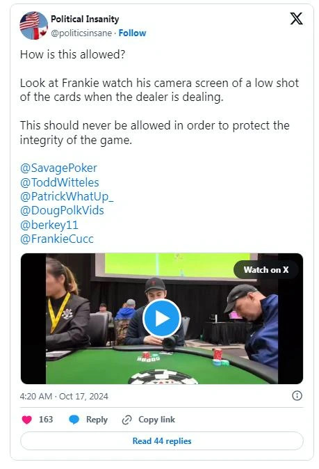 Frank ‘Frankie C’ Cucchiara 最近成为了扑克界Twitter上的热议焦点,因为他在拍摄视频博客时在牌桌上使用相机的行为引发了争议。尽管大多数反馈没有对Frankie造成负面影响,也没有人认为他作弊,但普遍观点认为这个问题需要被正视,因为这对扑克的形象不利。