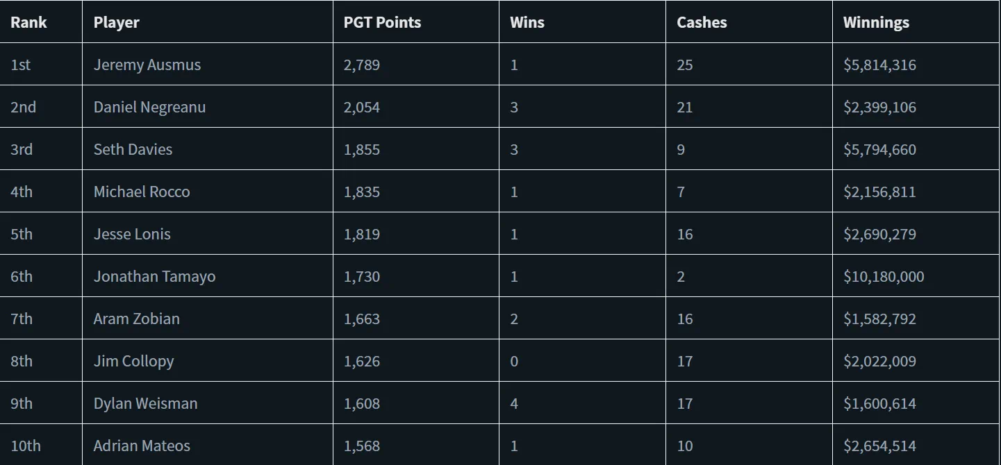 Jeremy Ausmus则继续以2,789分领跑PGT榜首,他现在以735积分优势领先第2名的丹牛。