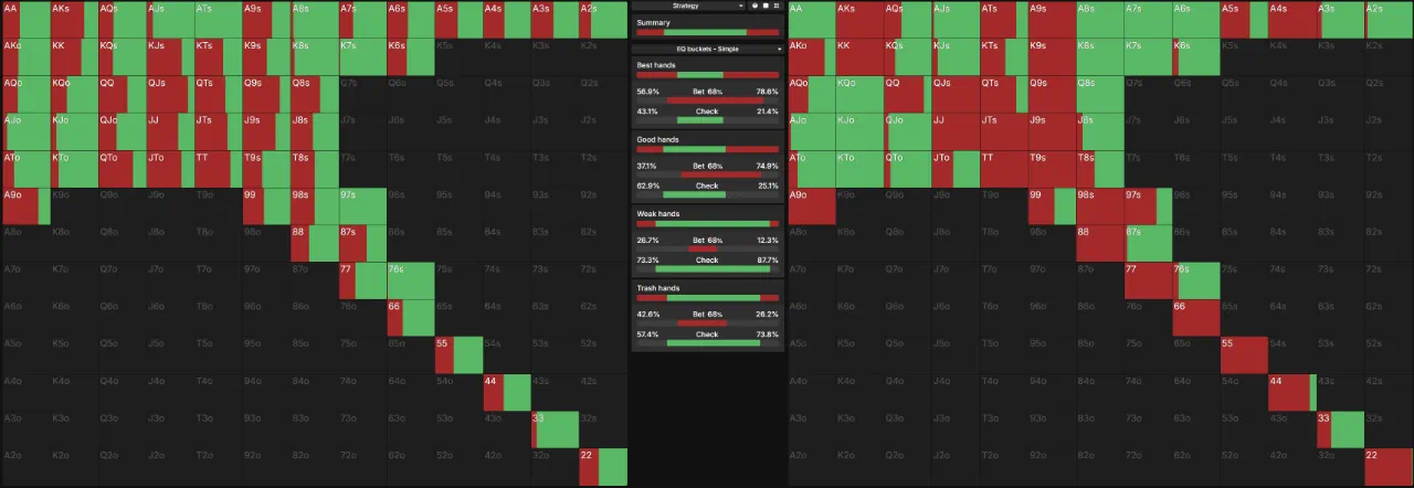 在左侧是UTG在GTO世界中的首个行动,右侧是如果按钮位更频繁地进行3-bet(他们应该3-bet约6%的时间,我们让他们加注35%的时间)时他们应该采取的行动。