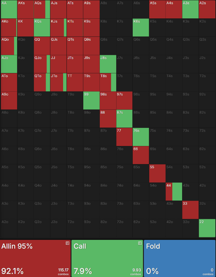 我们的诈唬频率有所下降,但我们仍然会诈唬。这是因为疯子的范围要弱得多,他们需要完全疯狂才会一直对我们进行3-bet。