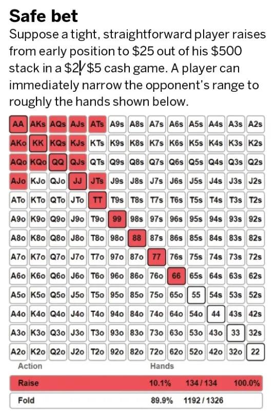 假设在$2/$5级别的cash游戏中,一位谨慎、直率的玩家从早期位置加注到$25,而他的筹码量为$500。你可以立即将对手的范围缩小到以下范围(表格中的红色部分):