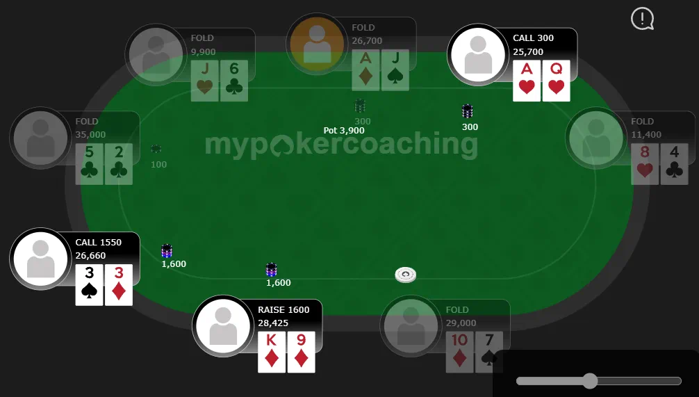 小盲位的Alex这手K♦9♦看起来还不错,但这种牌会让你陷入很多麻烦,尤其是在多人底池中。因此,他决定3bet是完全合理的。这样就有机会立即赢得底池,或者至少减少对手数量。
